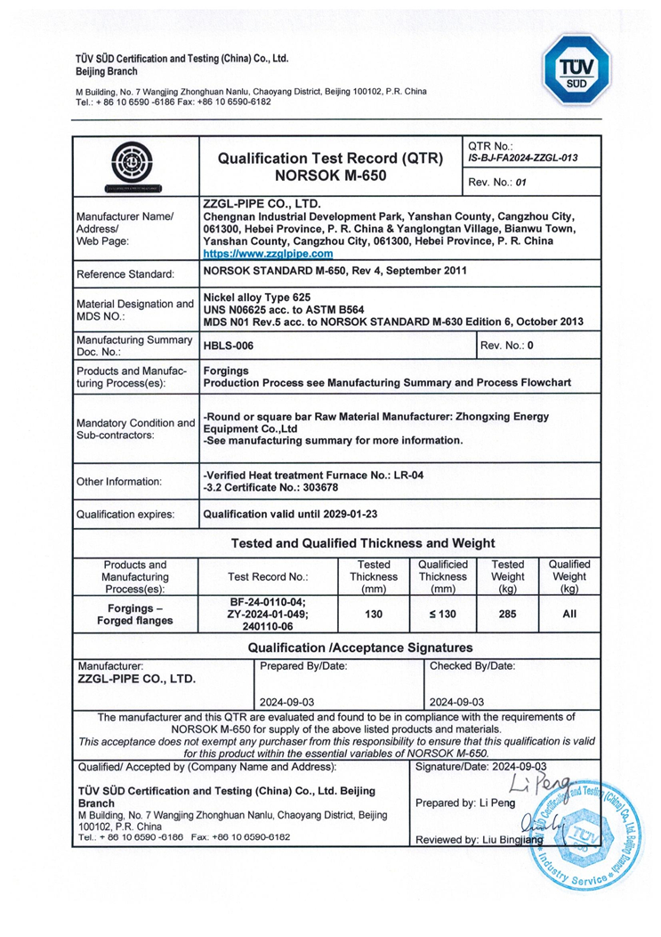 公司已通過(guò)挪威國(guó)家石油標(biāo)準(zhǔn)NORSOK M-650 ASTM B564 UNS N06625認(rèn)證。